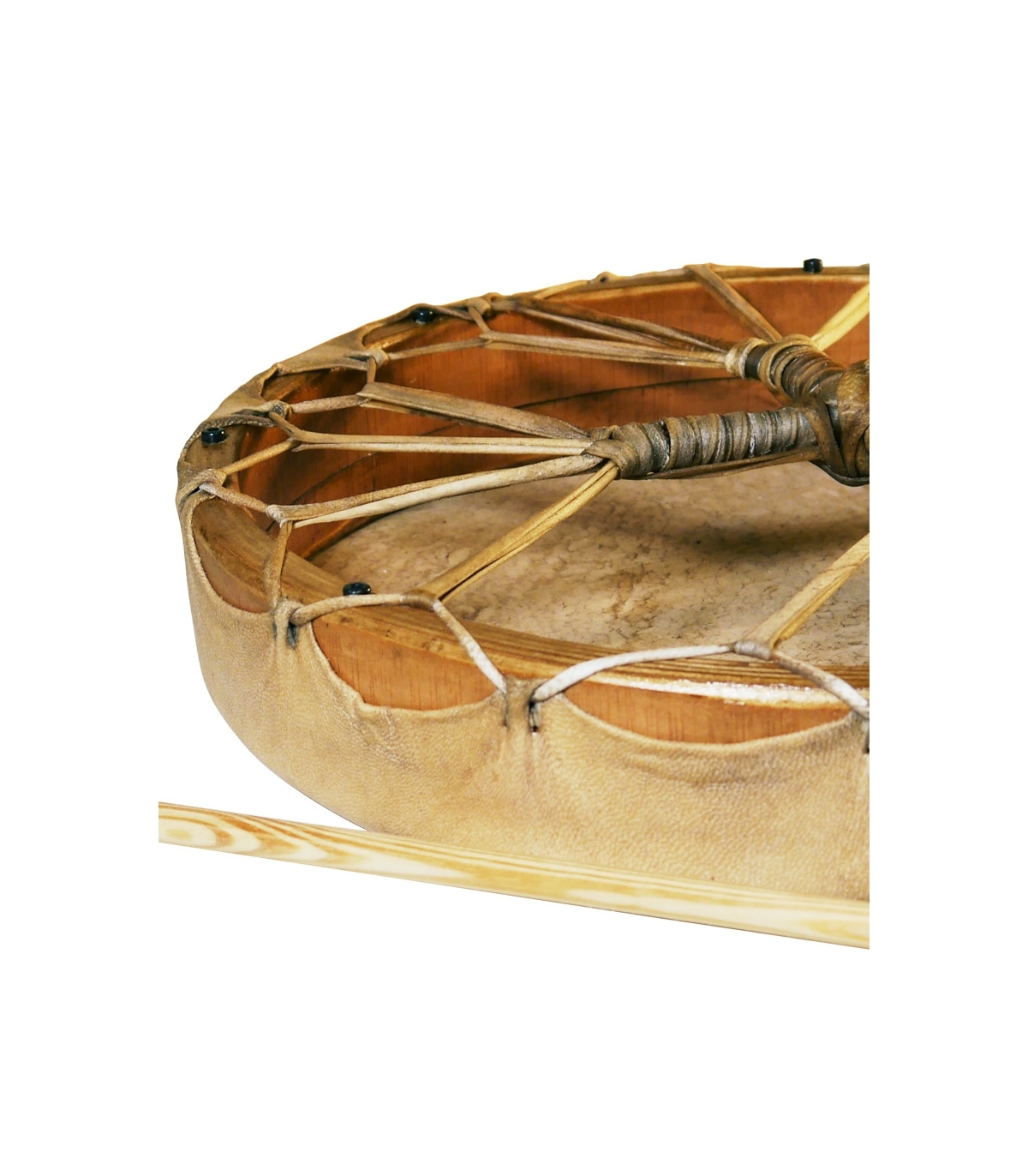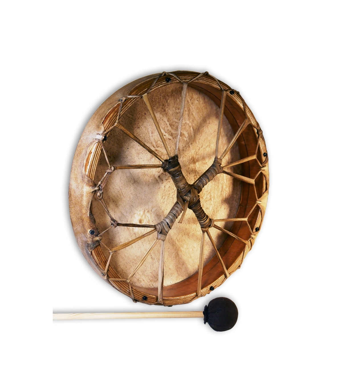El tambor cautiva con su artesanía impecable y su diseño auténtico. La piel de cabra, cuidadosamente seleccionada, confiere al tambor una autenticidad palpable, recordándonos las tradiciones ancestrales de los chamanes que han utilizado instrumentos similares a lo largo de la historia. Con un diámetro de 40 cm, este tambor redondo tiene el tamaño ideal para ser sostenido cómodamente durante largas sesiones de meditación y rituales chamánicos.